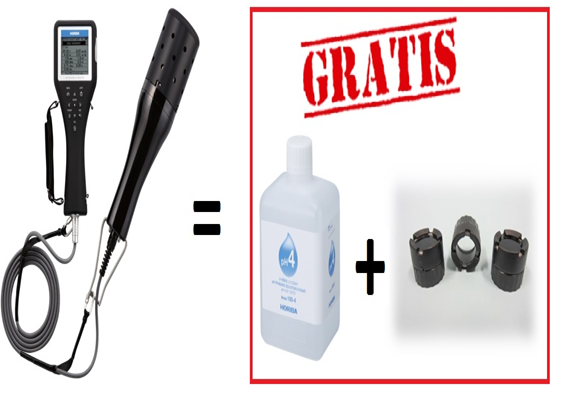 Compre una sonda multi paramétrica U-50 y recibe gratis una botella de solución de pH-4 de 4 litros para realizar la calibración automática simultánea de todos los parámetros del equipo así que un kit de 3 membranas de oxígeno disuelto.